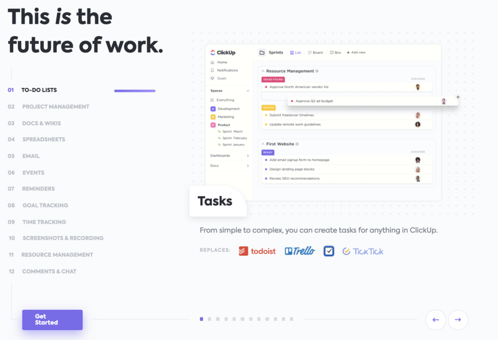 ClickUp عبارة عن أداة إدارة مشاريع، وتقدم هذه الأداة رسائل تذكير، وأهداف وتقويم، وغير ذلك الكثير لكل فريق في مجاله.