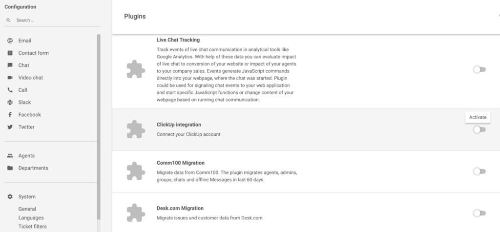 لربط ClickUp، قم بفتح حسابك في LiveAgent ومن ثم الذهاب إلى الإعدادات > النظام > الإضافات. ثم قم بإيجاد إضافة ClickUp من قائمة الإضافات، وانقر على مفتاح التفعيل وسيقوم LiveAgent بعدها بإعادة التشغيل.