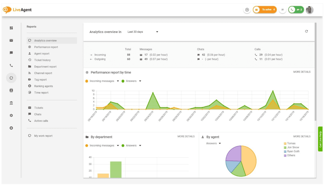 يعد برنامج LiveAgent الأكثر استعراضًا وبرنامج المساعدة المكتبي رقم واحد بالنسبة للشركات الصغيرة والمتوسطة في 2020، وذلك ما يجعله بديلًا ممتازً عن Zoho Desk. يوفر عليك LiveAgent الوقت والمال، لذا يمكنك التركيز على ما هو مهم — بناء علاقات قوية مع زبائنك.