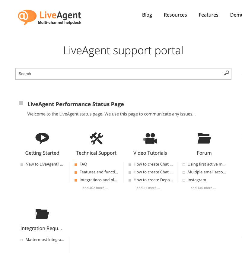 يقدم LiveAgent مجموعة متنوعة من الخصائص لمساعدة الشركات على التواصل مع العملاء. كما يقدم مكتبة ضخمة من المصادر لعملائه. وتتضمن هذه المصادر منشورات المدونة والقوالب وقائمة المصطلحات واختبارات الكتابة وإضافة WordPress والأدلة والندوات عبر الإنترنت والأكاديمية والمزيد غير ذلك.