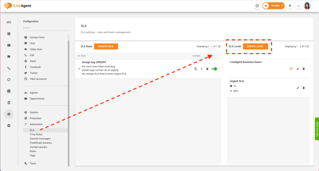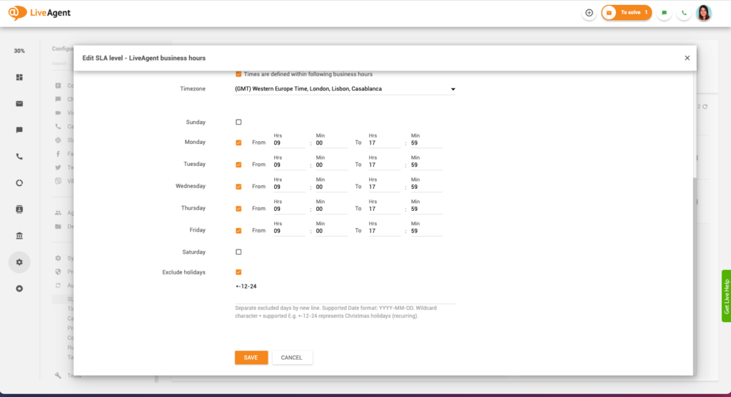 تعمل خاصية ساعات العمل في LiveAgent على إعداد مستويات اتفاقية مستوى الخدمة الخاصة بك لتنفيذ إجراءات فقط خلال فترات زمنية محددة مع إمكانية استبعاد أيام العطل.